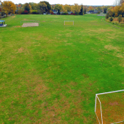 The basketball court is resurfaced with new lines painted. A larger area of the park has been cleared and mowed to make it easier to play soccer and football.